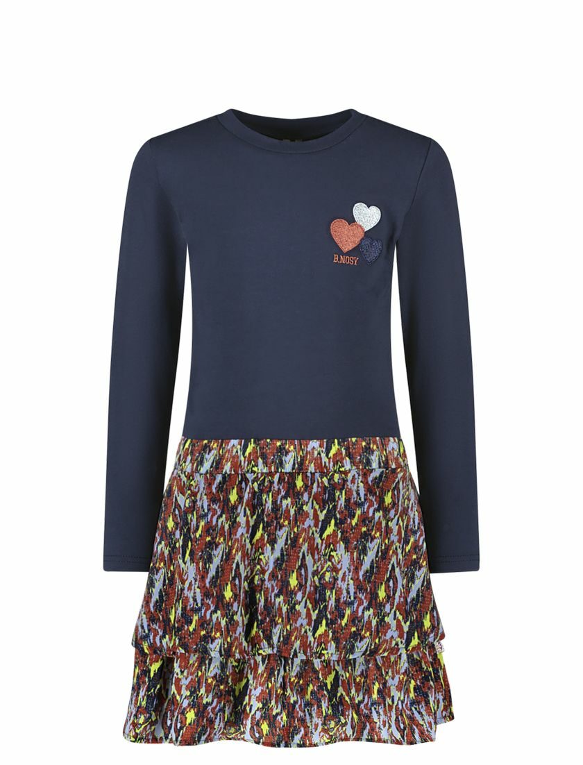 C’est la robe B.Nosy Dante ! Le haut de cette robe a un col roulé bas et est fait d’un tissu en jersey doux. La jupe a une bande élastique et est faite d’un tissu tissé dans un imprimé abstrait fabriqué à partir de polyester recyclé. C’est la robe parfaite pour un usage quotidien et de fête !
