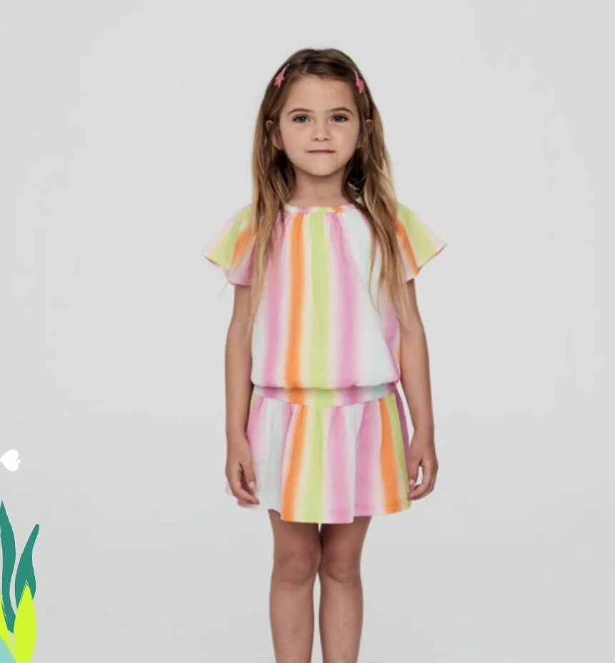 Chemisier plat multicolore avec col et taille froncés pour fille. Jupe plate multicolore pour fille. Collection Coquillage.